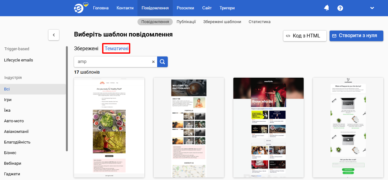 Крім окремих блоків, ви можете використовувати готові AMP-шаблони з бібліотеки у своєму обліковому записі.