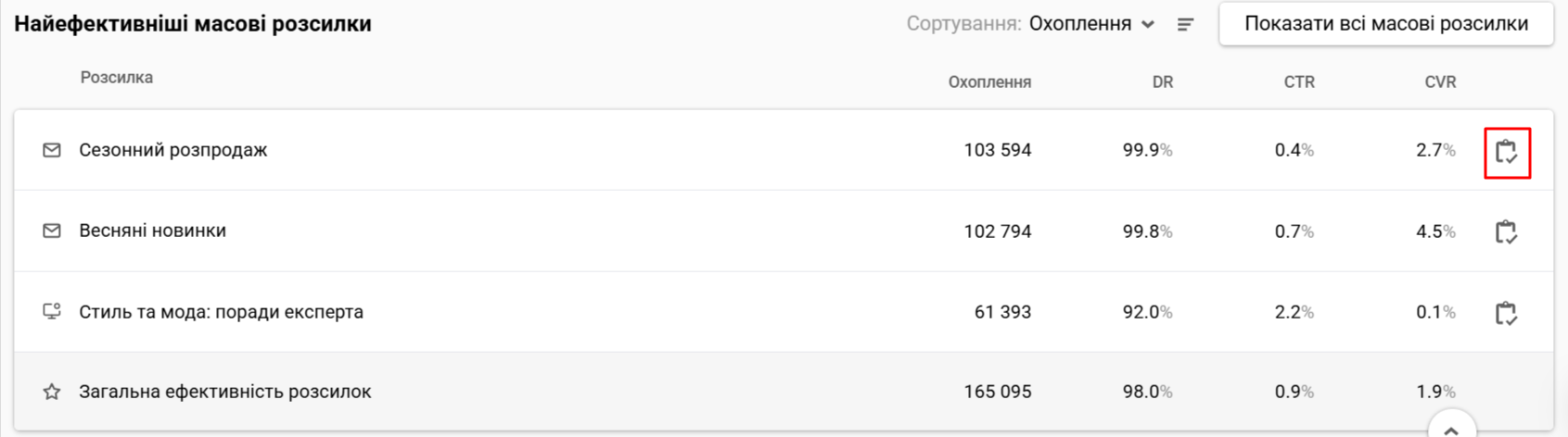 - Показати звіт за розсилкою: натисніть іконку поруч із назвою розсилки, щоб перейти до звіту за нею.
