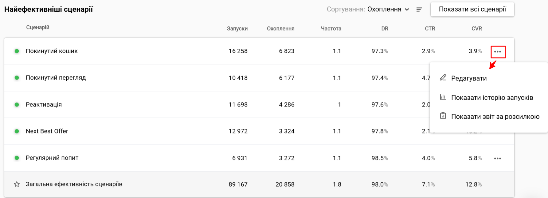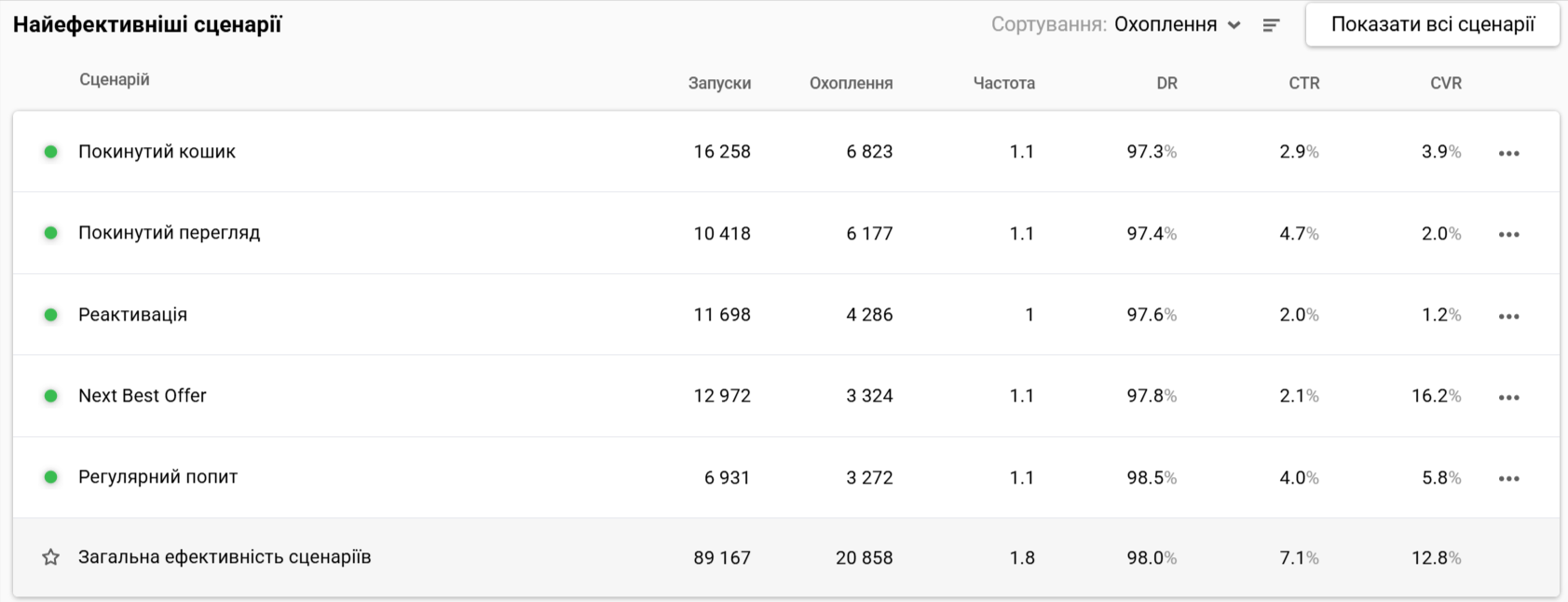 | Коефіцієнт переходів (CTR) | (Переходи ÷ Доставлено) × 100% | (Переходи ÷ Доставлено) × 100% у межах кожного каналу | (Переходи ÷ Доставлено) × 100% у межах кожного сценарію | (Унікальні переходи ÷ Доставлено) × 100% × 100% для кожної розсилки |