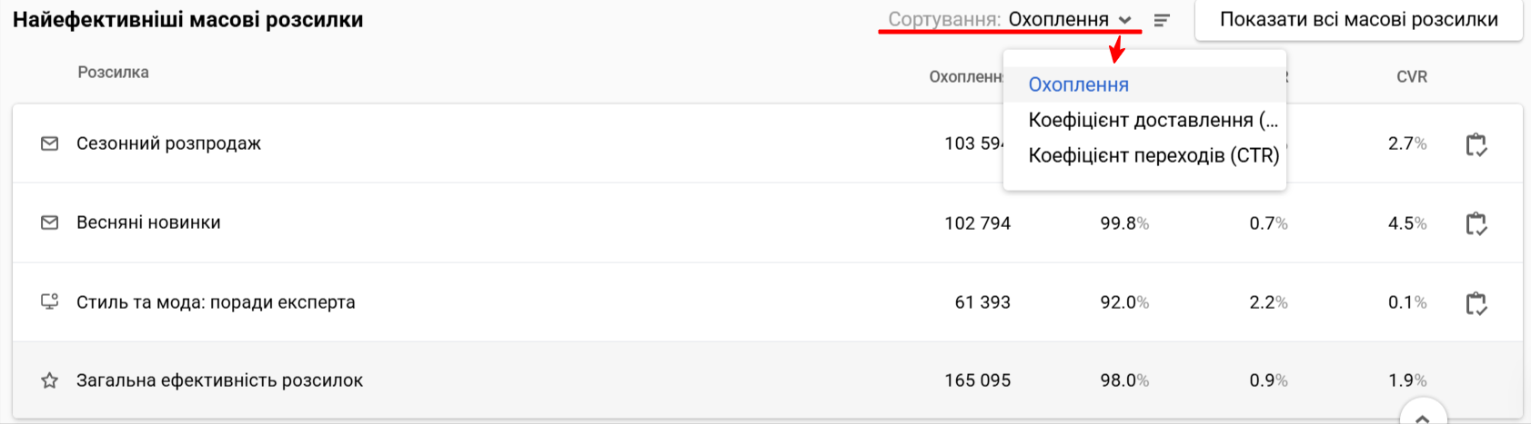 | Коефіцієнт конверсій (CVR) | (Конверсії ÷ Переходи) × 100% | (Конверсії ÷ Переходи) × 100% у межах кожного каналу | (Конверсії ÷ Переходи) × 100% у межах кожного сценарію | (Конверсії ÷ Переходи) × 100% для кожної розсилки |