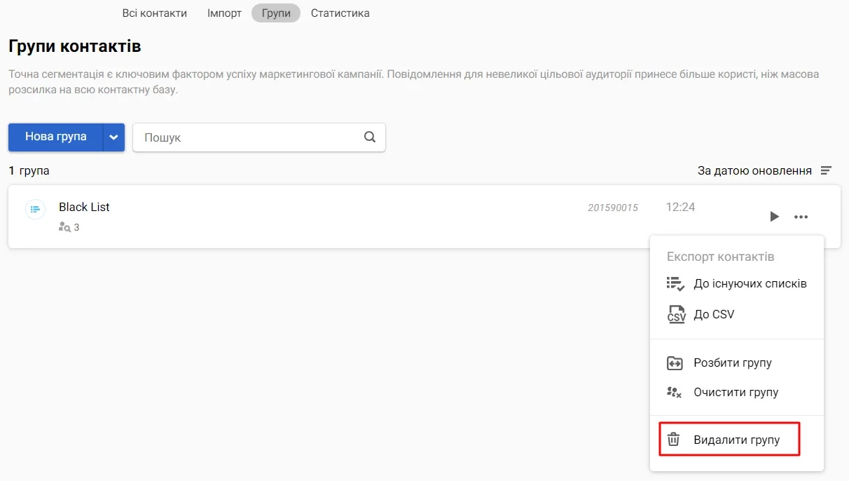 Створена вами група відобразиться в розділі Групи контактів. Ви матимете змогу її видалити так само, як і список, створений за допомогою вивантаження з розділу Всі контакти.