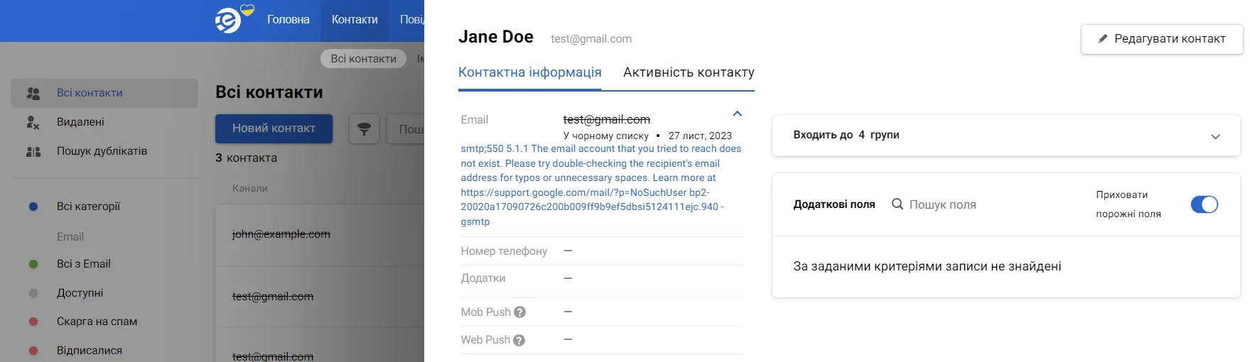 Щоб з'ясувати причину додавання до чорного списку, потрібно перейти до картки контакту за кліком по рядку з його даними. Наприклад, на скріні нижче як підставу для блокування показано відповідь поштовика, що такий email не існує.
