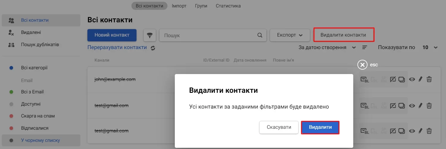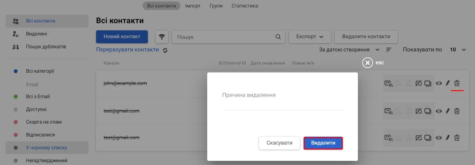 Щоб видалити окремі контакти, перейдіть в Всі контакти. Виберіть вкладку Email або Номер телефону, у якій ви бажаєте знайти й видалити контакт. Клікніть іконку видалення (корзина) у рядку обраного вами підписника. Далі ви за бажанням можете додати причину видалення на випадок його відновлення в майбутньому. Натисніть Видалити.