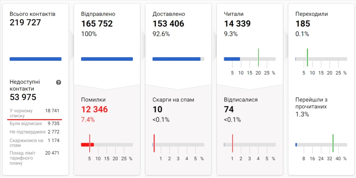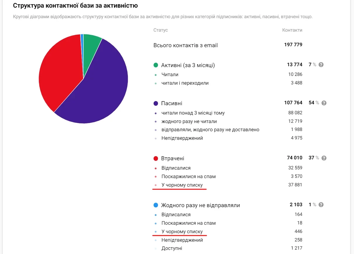 Кількість контактів із чорного списка можна знайти в останніх двох категоріях. При цьому до Втрачених поміщаються ті, що раніше отримували від вас повідомлення, а пізніше були заблоковані, а до групи Жодного разу не отримували — контакти, за якими взагалі не здійснювалося відправлення, оскільки вони одразу маркувалися нашою системою як чорний список.