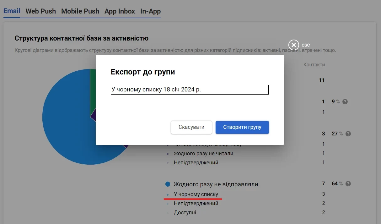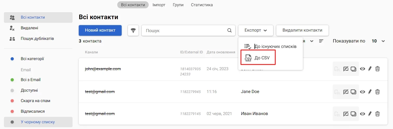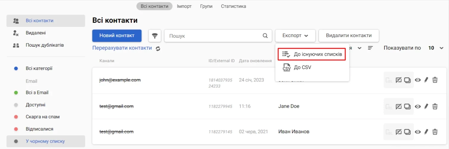 Після цього у розділі Всі контакти клікніть категорію У чорному списку в потрібному вам каналі (email/номер телефону); натисніть Експорт → До існуючих списків, і виберіть створену групу.