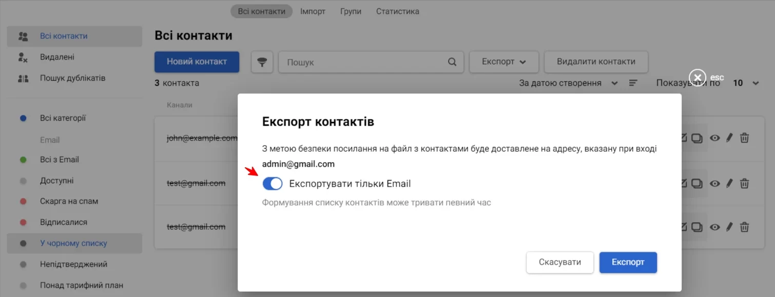 Далі клікніть кнопку Експорт. У випадку, якщо активною є опція Експортувати тільки Email, ваш файл міститиме тільки поштові адреси; щоб отримати всі дані про контакти, які зберігаються в eSputnik, вимкніть цю опцію.