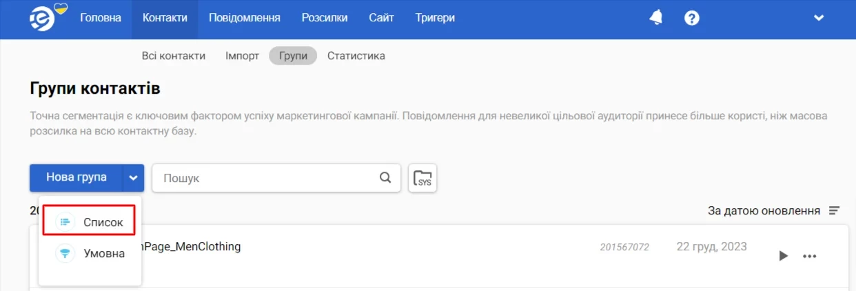 Створіть групу, до якої бажаєте вивантажити контакти, у розділі Контакти → Групи → Нова група → Список (створити без контактів).