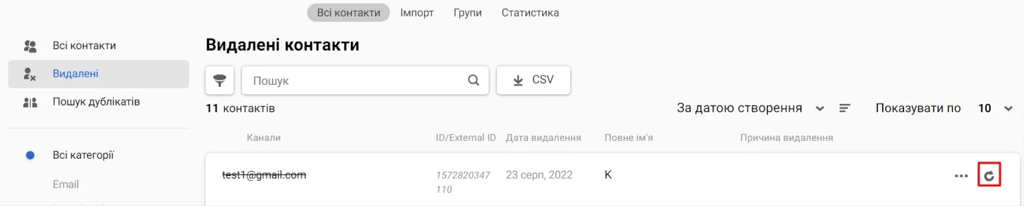 Якщо ви вибираєте опцію видалення контакту або групи разом із контактами, вони переміщуються до розділу Видалені. Статуси контактів продовжують зберігатися в eSputnik, проте контакти перестають відображатися у вкладці Всі контакти.