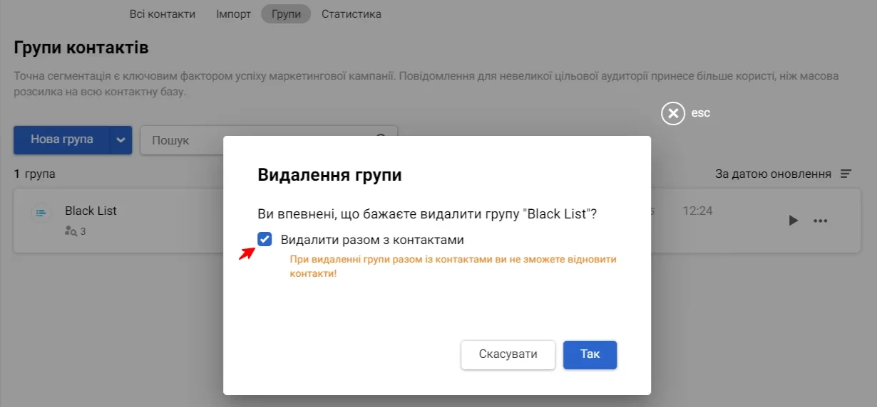 Підтвердіть видалення групи разом із контактами, поставивши відповідну галочку й натиснувши кнопку Так.