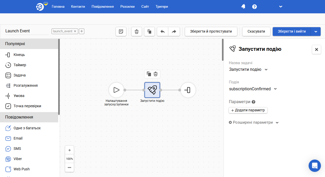 Наприклад: коли людина заповнює форму підписки, контакт потрапляє до eSputnik із непідтвердженим email і йому на пошту надходить повідомлення з проханням підтвердити підписку. Доки він не перейде за посиланням підтвердження, контакт не отримуватиме розсилки. Коли людина підтверджує підписку, запускається сценарій, спрацьовує задача Підтвердити контакт і вона стає активною в системі.