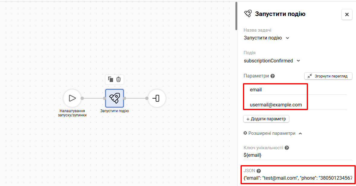 ${emailAddress}або[email protected]Якщо у вас у події інша назва змінної, необхідно вписати в поле саме цю назву. У наших системних подіях змінна зветьсяemailAddress. Системні події — це ті, що генеруються всередині самої системи (клік кнопки в листі, запуск регулярного сценарію за групою, форма підписки, реактивація за допомогою RFM-аналізу). Для них у поле треба вписати${emailAddress}. - Номер телефону – номер телефону контакту.