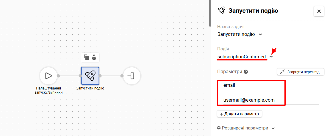 За замовчуванням система перевіряє, підтверджений контакт чи ні, за email. У полі Email необхідно прописати назву змінної або email-адресу. Наприклад, ${emailAddress} або [email protected].