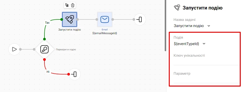 ${parameter}(назва параметра у події, наприклад${city}) – у цьому випадку порівнюється поле контакту, вказане у Полі контакту, зі значенням із зазначеного параметра у події. Також можна задати рядок у форматі123abc(наприклад, Київ) – тоді відбувається порівняння поля контакту з конкретним значенням, вказаним у параметрі (тобто, чи дорівнює поле контакту 123abc?).