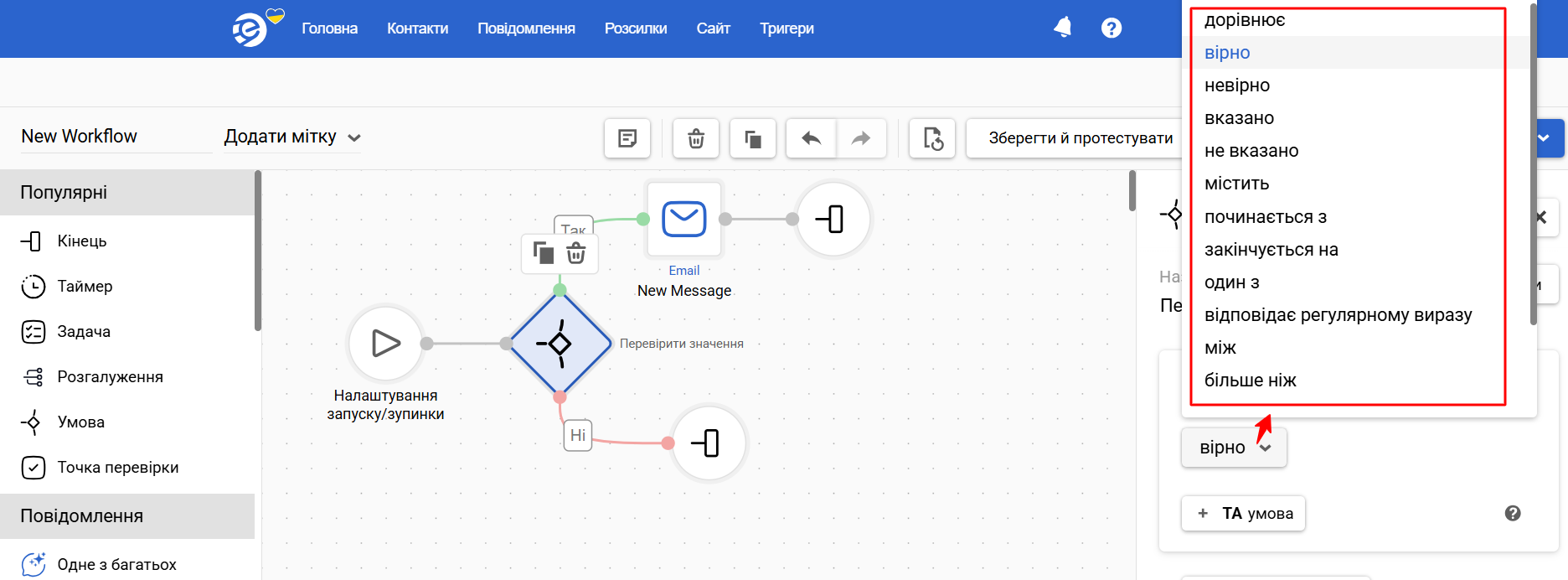- Поле контакта — поле із картки контакту, відповідність якого потрібно перевірити. Можна вибрати зі списку або за допомогою пошуку в рядку. Порівнювати можна поля таких типів: текстове поле, текстова область, число, дробове число, випадаючий список.