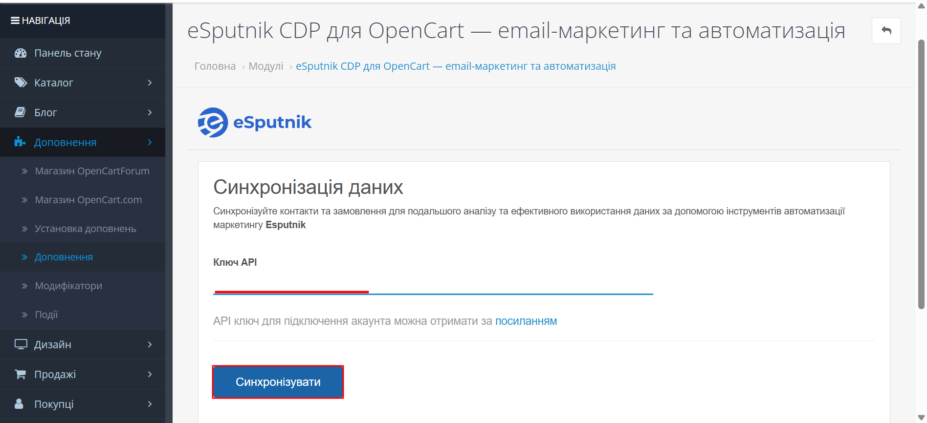 - Введіть ключ Full Access to API з вашого облікового запису eSputnik та натисніть Синхронізувати.