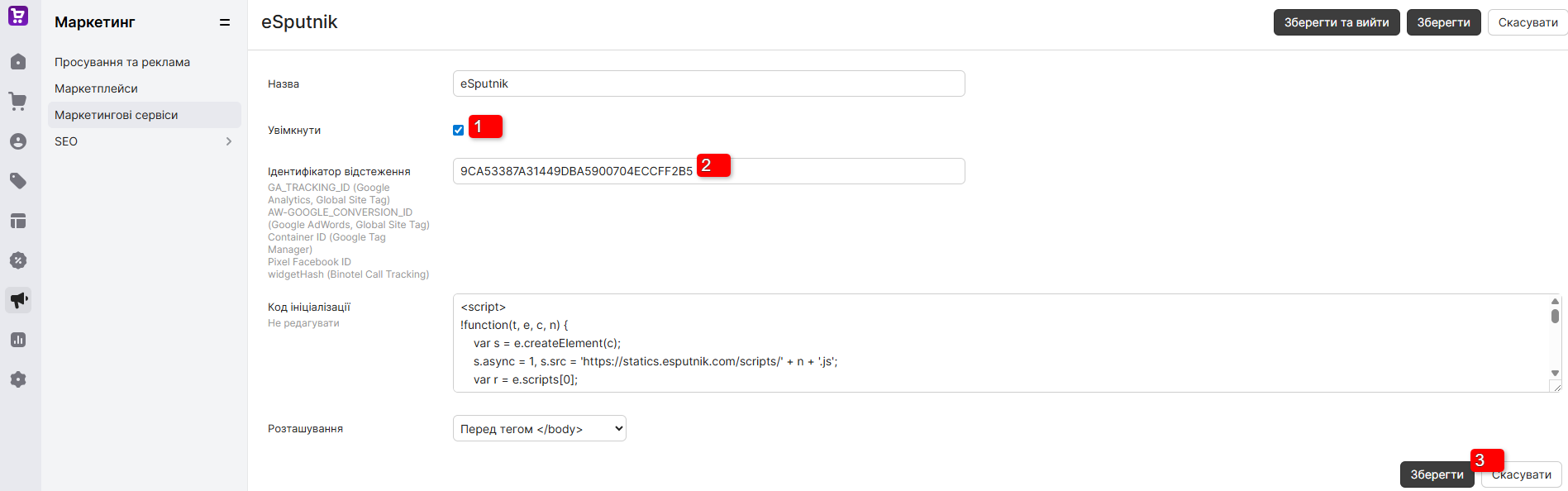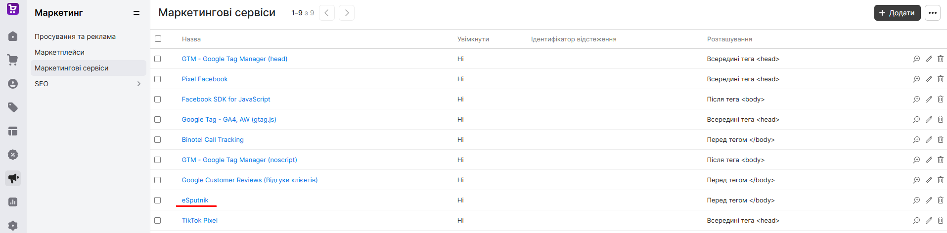 В акаунті Хорошоп перейдіть до розділу Маркетинг → Маркетингові сервіси, знайдіть і натисніть для редагування eSputnik .