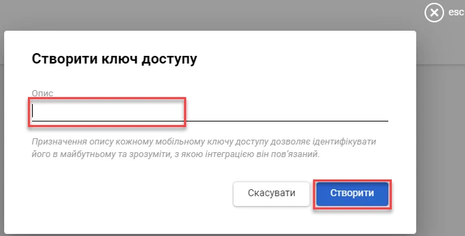 - У діалоговому вікні Створити ключ доступу введіть опис ключа в полі Опис і натисніть Створити. Новий ключ з’явиться у вкладці «Ключі доступу» мобільного додатка.