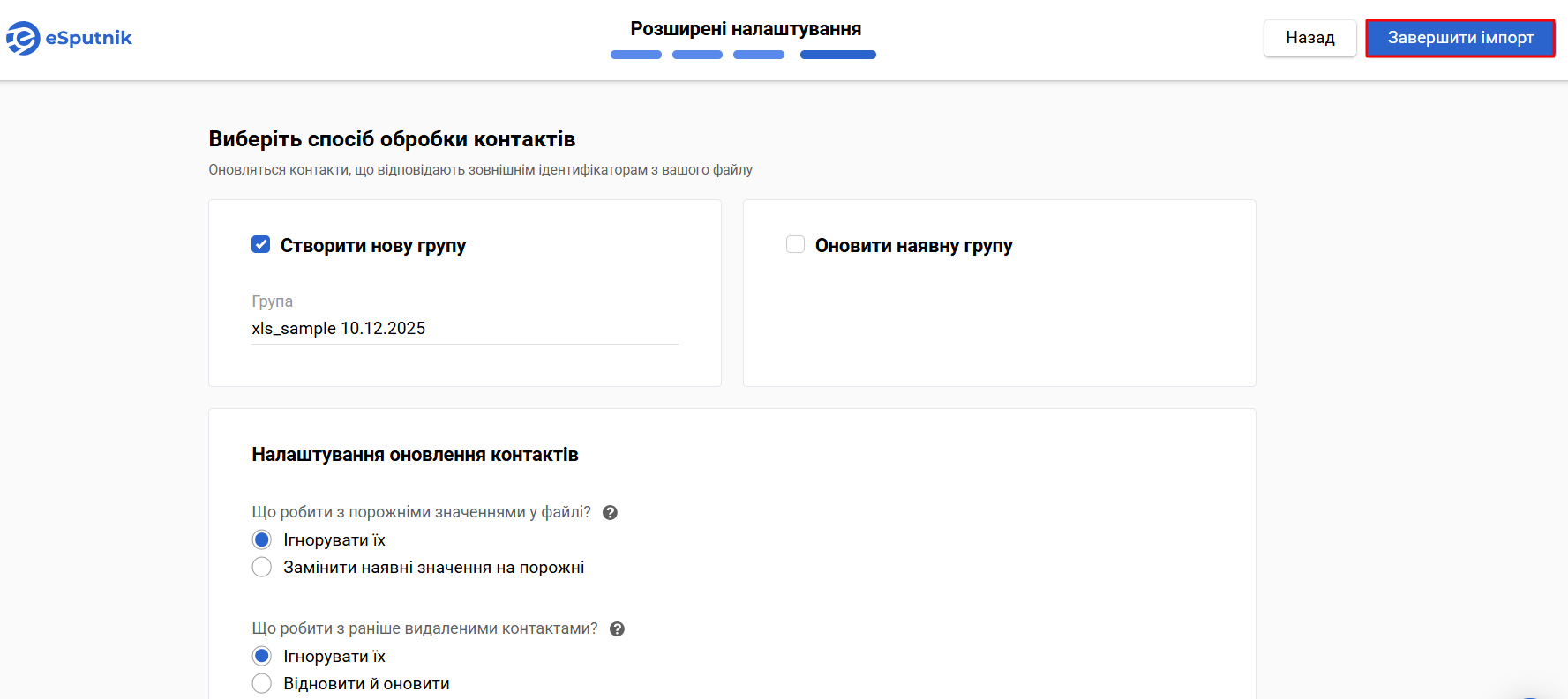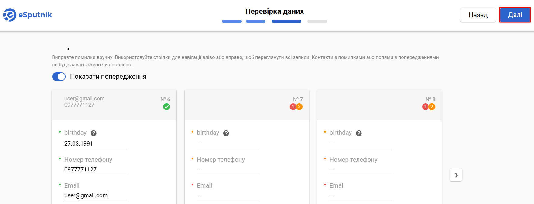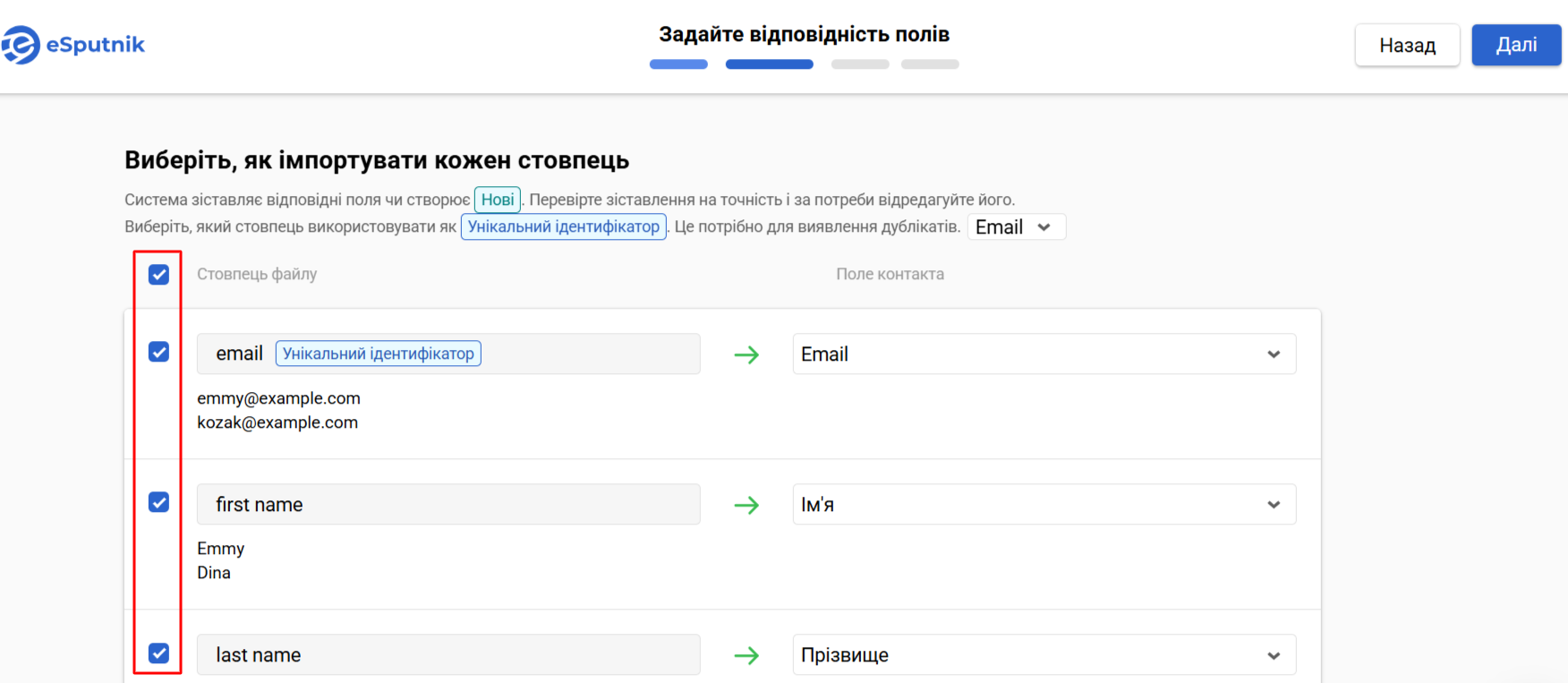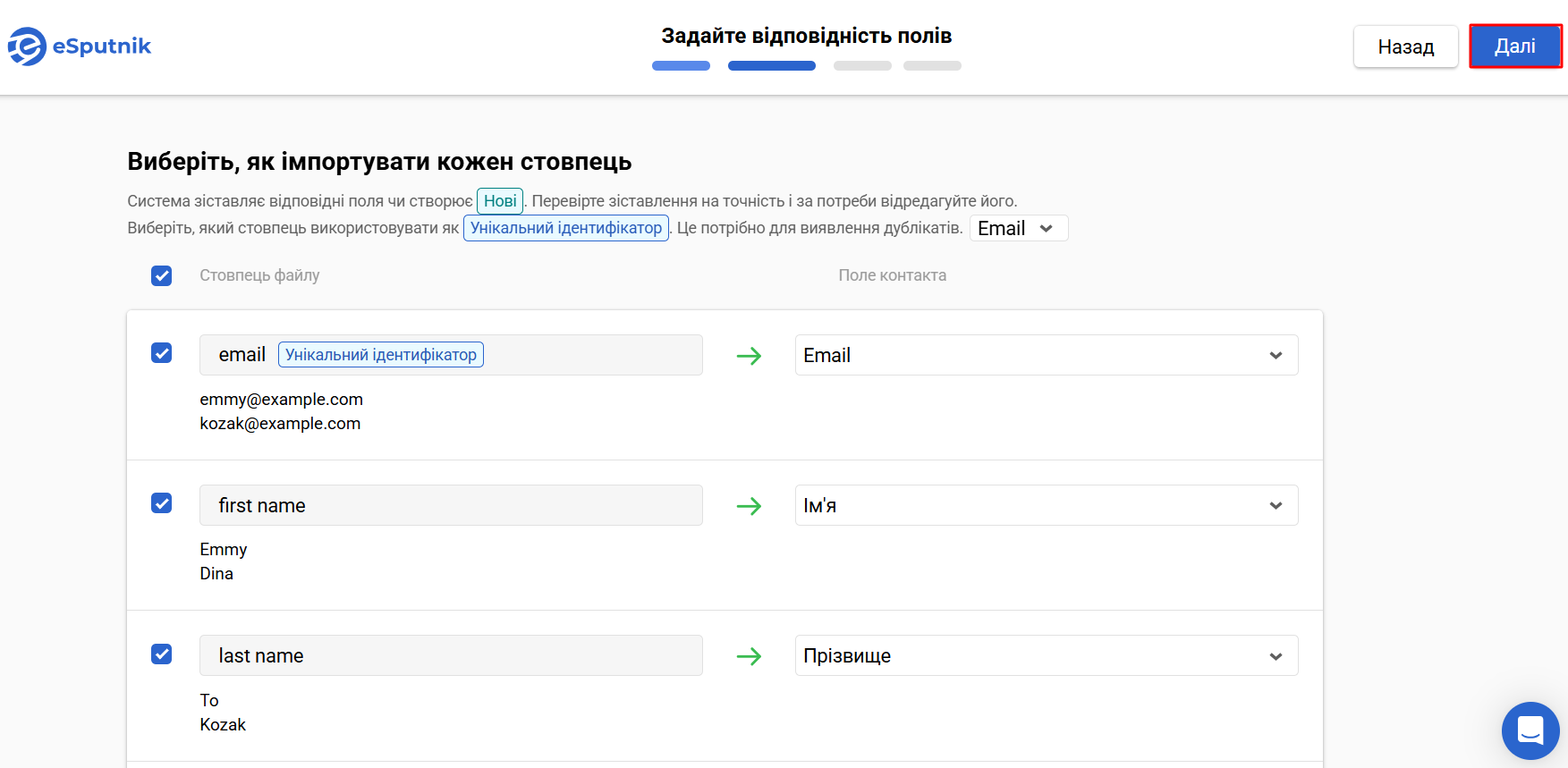 Кожен стовпець вашого файлу містить певний тип даних контакта, наприклад email, телефон тощо. Система зіставляє відповідні поля або створює нові у вашому акаунті eSputnik. Перевірте правильність зіставлення та за потреби внесіть зміни.