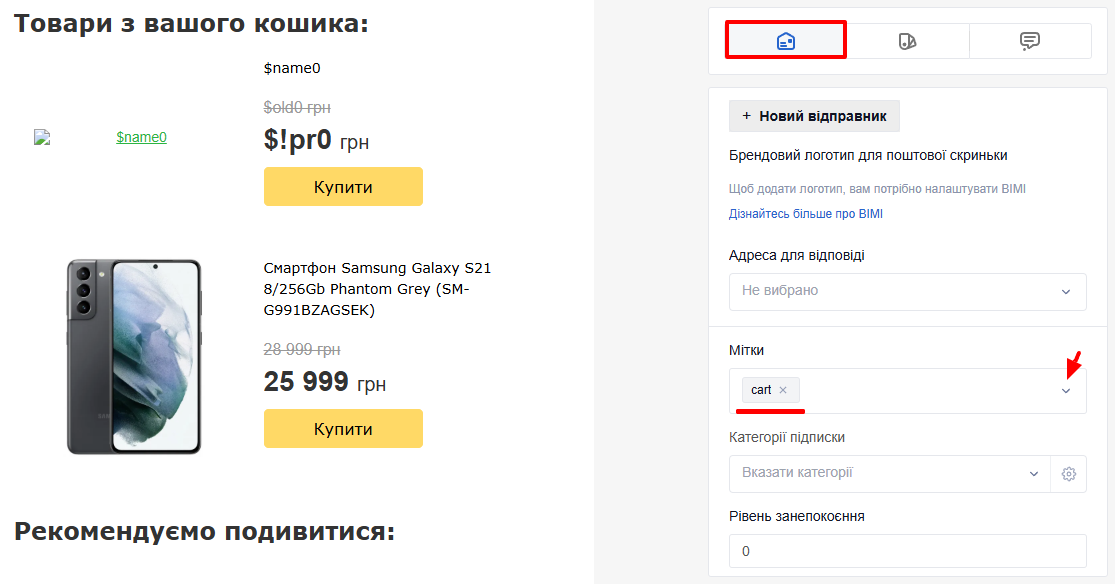 Також ми рекомендуємо задати для листа мітку Cart. Це в подальшому полегшить моніторинг роботи тригера, дозволяючи швидко знаходити у звітах листи, що відправляються: