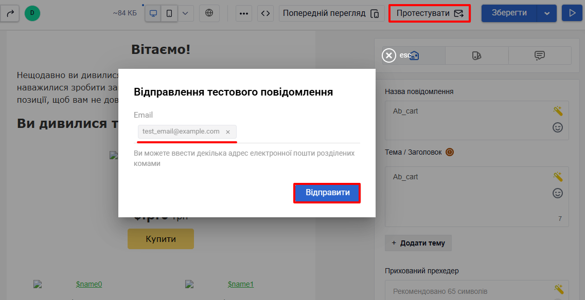 - Відправлення тестового листа контакту, який покинув кошик на сайті. Для цього відкрийте повідомлення в редакторі та у верхньому меню праворуч натисніть кнопку TEST: