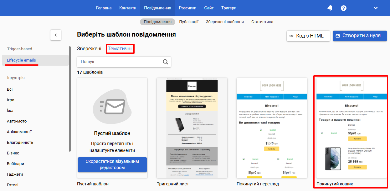 Його можна зробити на базі заздалегідь підготовленого в системі шаблона. Для цього перейдіть у Повідомлення → Повідомлення, натисніть Створити Email та у вкладці Тематичні виберіть Покинутий кошик: