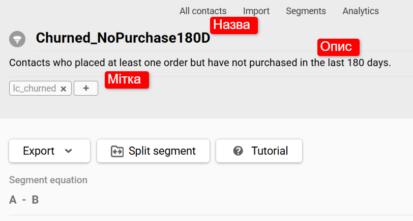 SegmentRule | Ключова умова, що визначає групу, у зрозумілих термінах | NoPurchase60D, OrderedLast30D, CartAbandoned7D, AOVover200 |