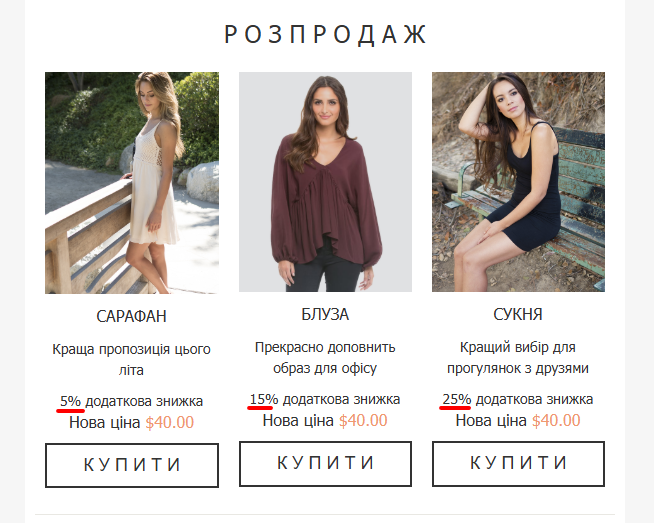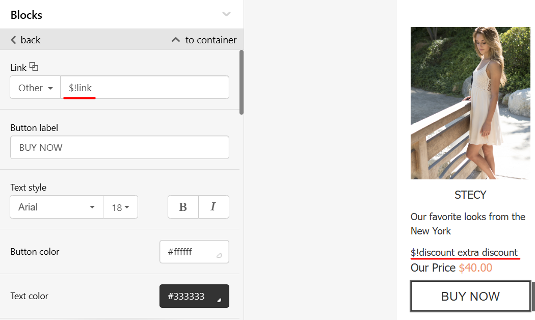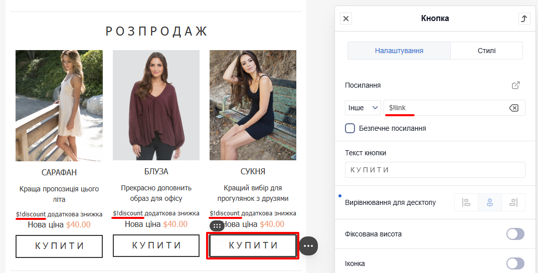 Значення 5% замінює змінну discount, а значення https://site.com/items_for_sale замінює змінну link та підставляється в кнопку.
