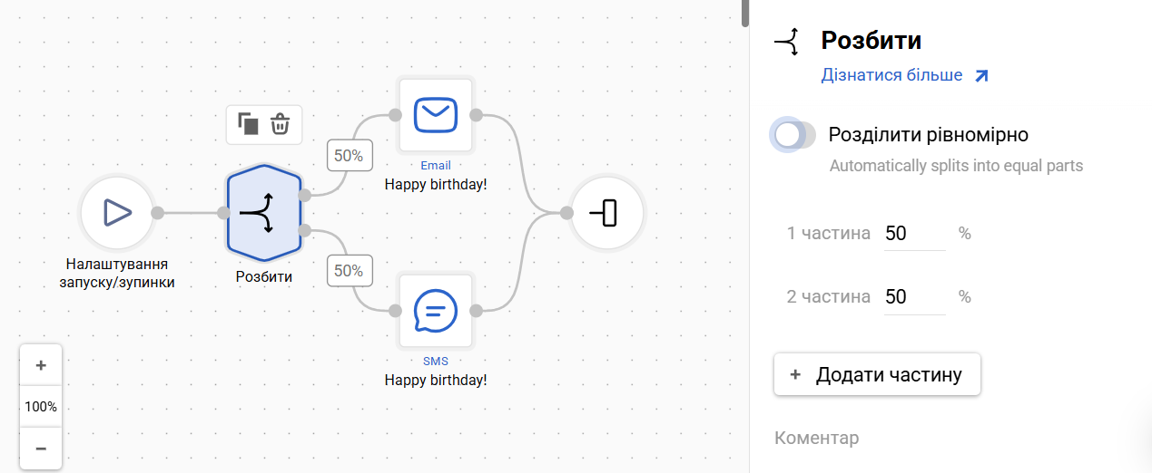 Наприклад, ви можете створити сценарій для тестування ефективності каналів комунікації або двох варіантів повідомлення в одному каналі, встановивши для них однаковий відсоток спрацьовування.