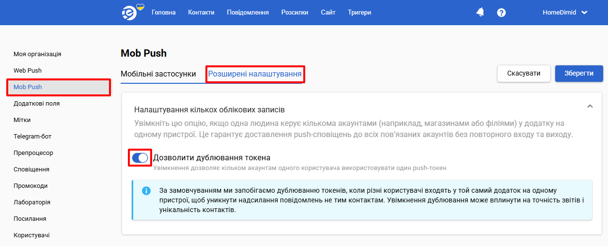- У налаштуваннях акаунту перейдіть на вкладку Mob Push → Розширені налаштування та активуйте перемикач Дозволити дублювання токена.