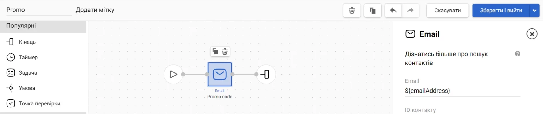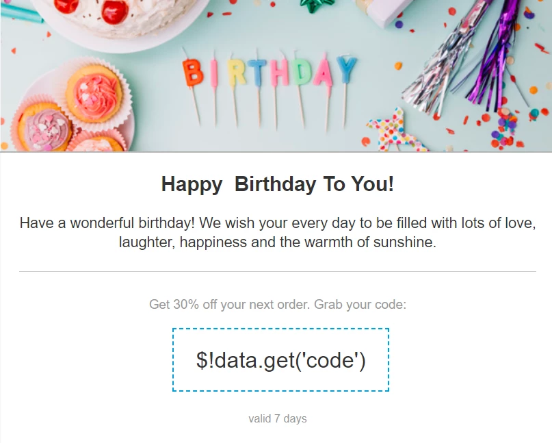 Додайте у повідомлення назву змінної, яка містить промокод, у форматі $!code. Замість змінної контакт побачить промокод, переданий у події.