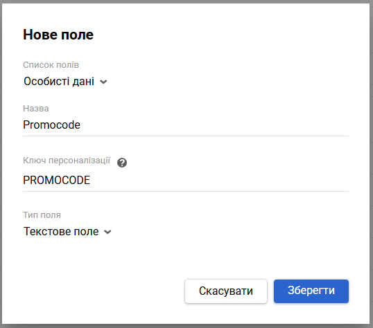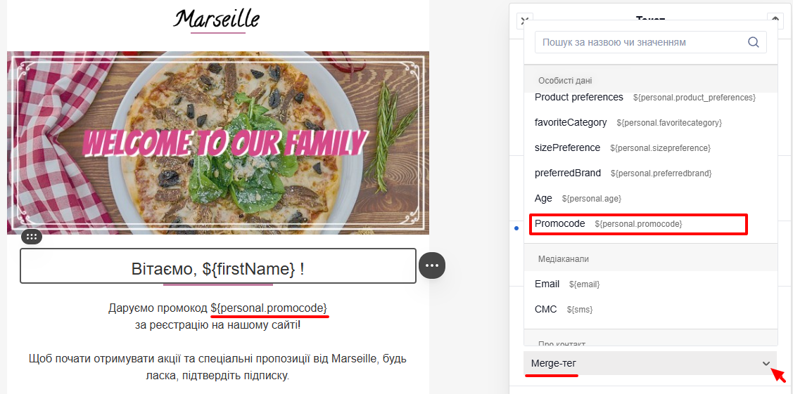 Для цього ви можете навести курсив у потрібне місце повідомлення, натиснути пункт Персоналізація в меню, після чого вибрати поле з промокодом. Система сама підставить потрібну змінну.