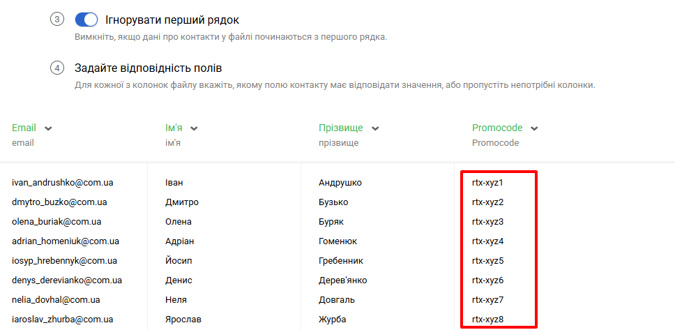 Через імпорт контактів ви завантажуєте файл із контактами та промокодами. У налаштуванні відповідності полів вибираєте створене поле Промокод для стовпчика з промокодами. Система оновить контакти й додасть промокоди до відповідних контактів.
