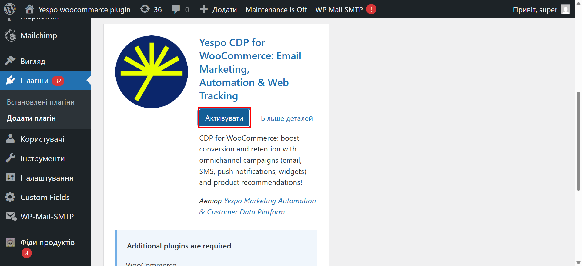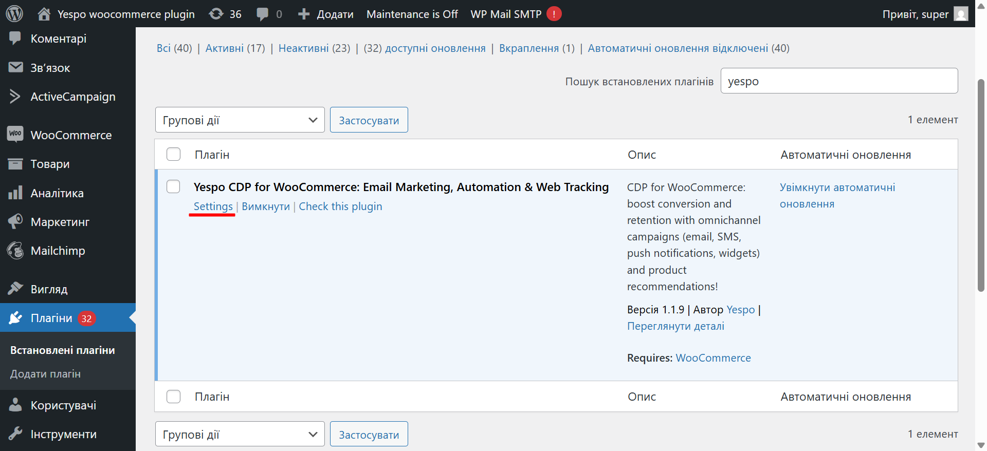 - Натисніть кнопку Налаштування під плагіном у розділі Встановлені плагіни або перейдіть на окрему сторінку Yespo.
