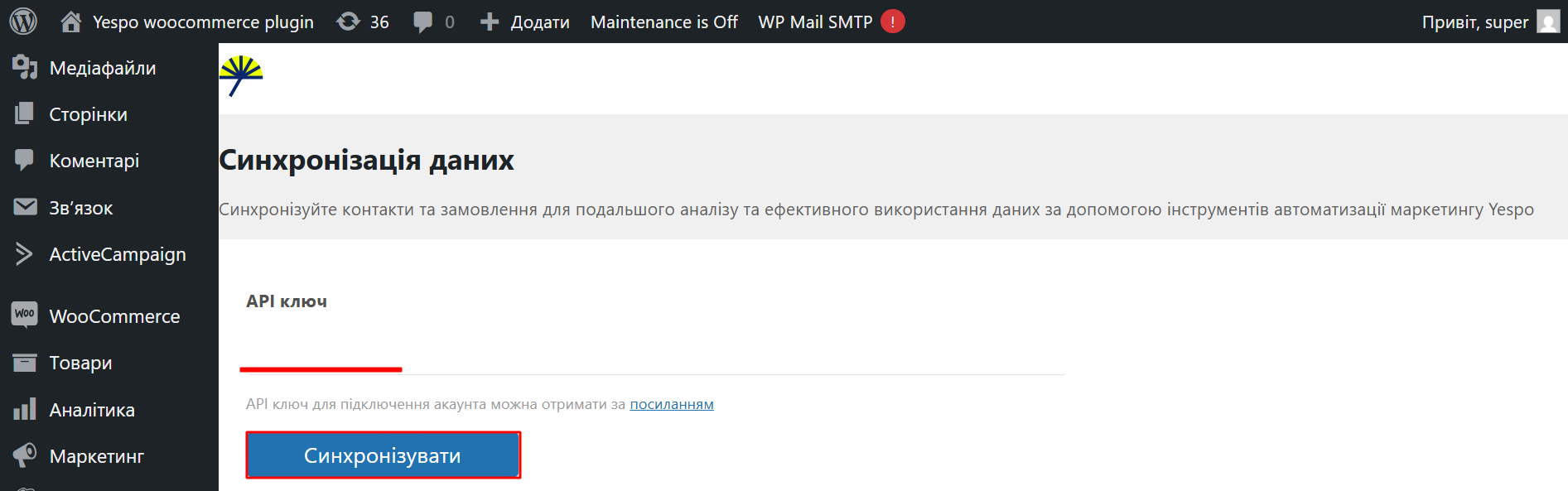 - Введіть свій ключ API з повним доступом з облікового запису eSputnik і натисніть Синхронізувати, щоб розпочати синхронізацію даних.