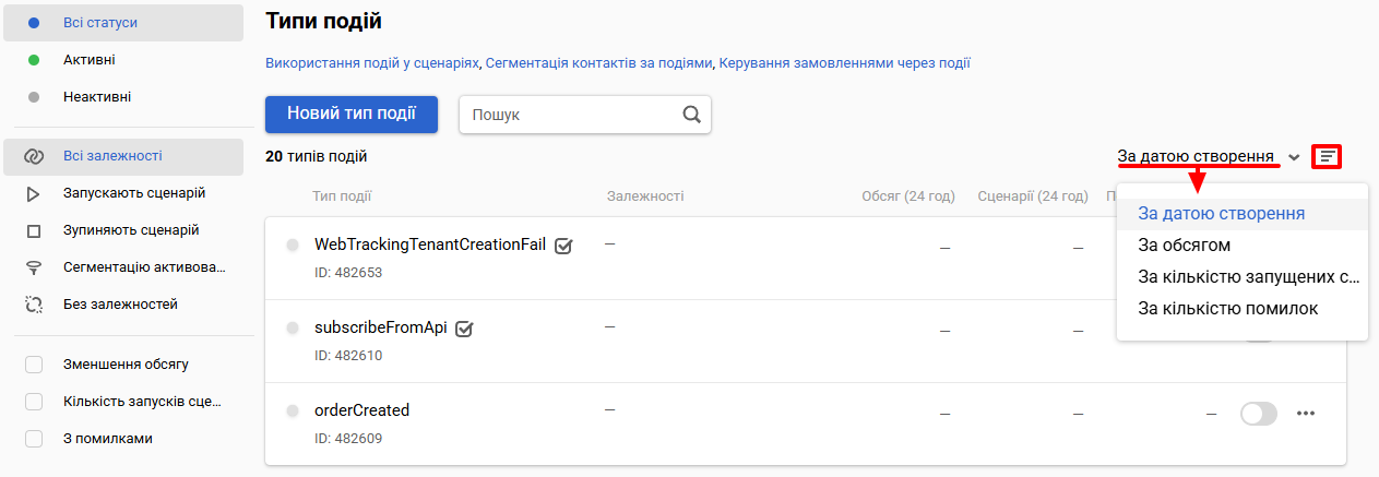 Для сортування подій за активністю оберіть відповідний фільтр: