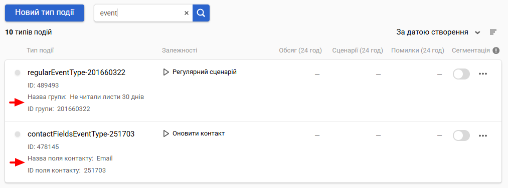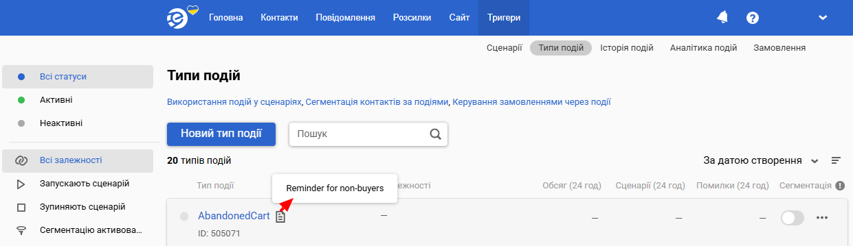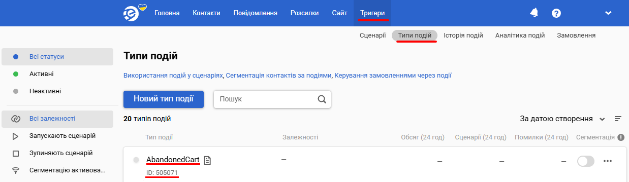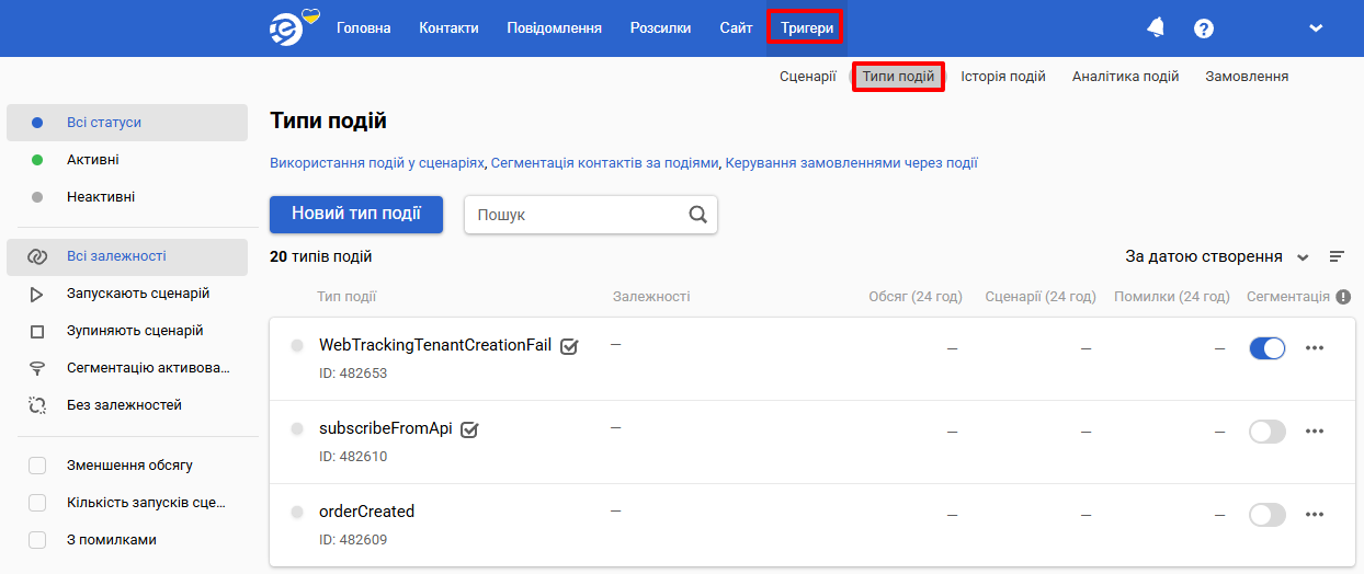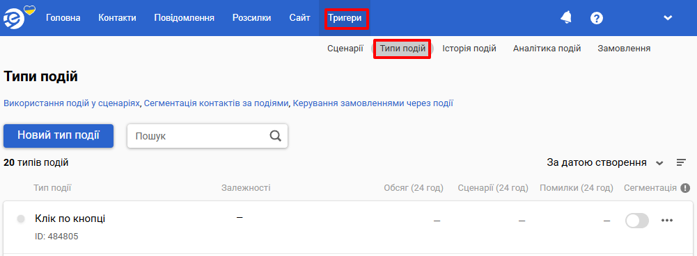 Усі створені й передані події відображаються в розділі Тригери → Типи подій.
