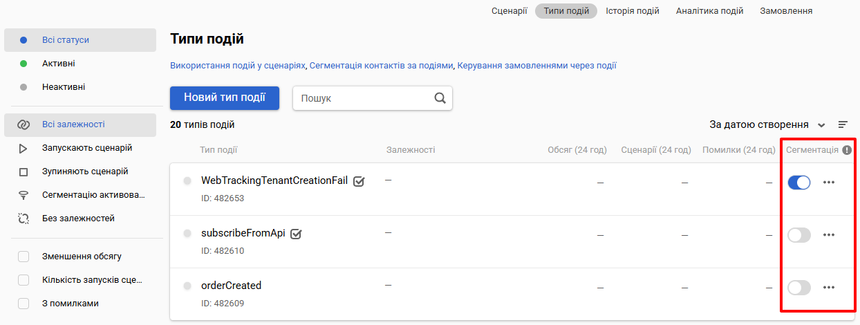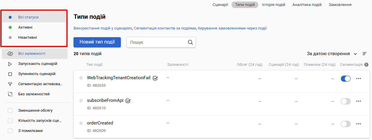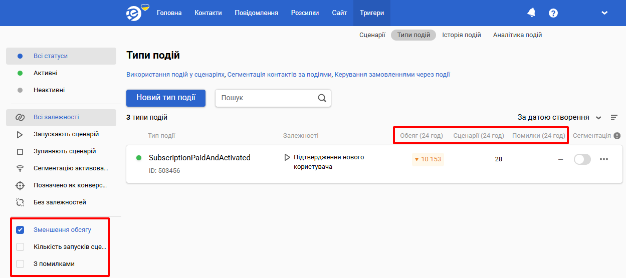 Можна відфільтрувати типи подій та сценарії, що мають зменшені показники, а також події з помилками. Для цього активуйте прапорець на вкладці у меню ліворуч: