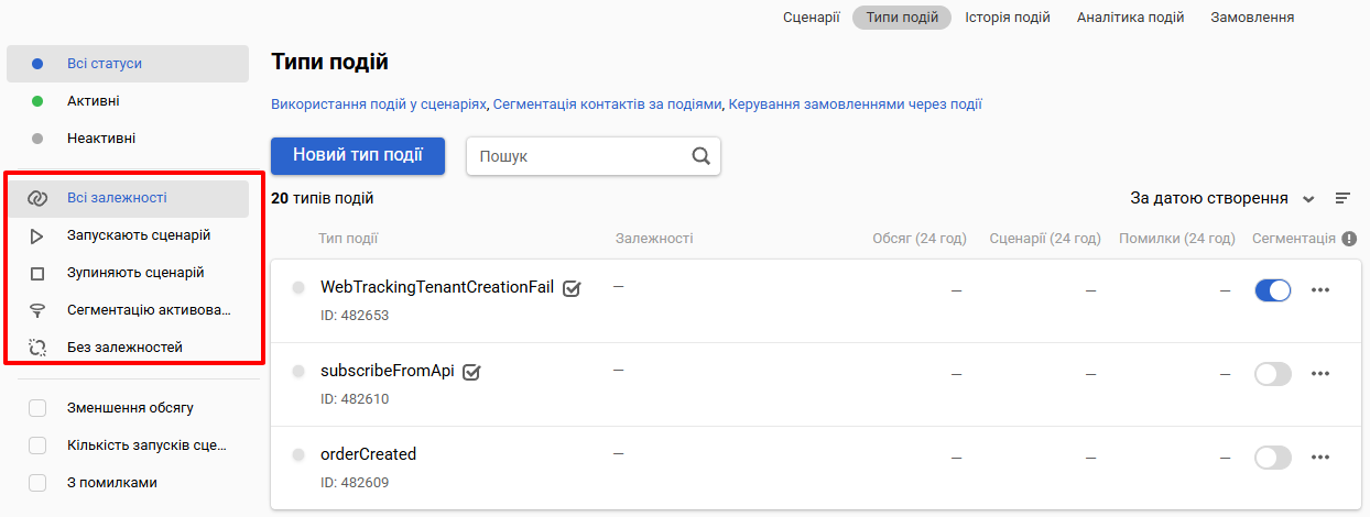 Для фільтрації типів подій за залежностями виберіть вкладку: