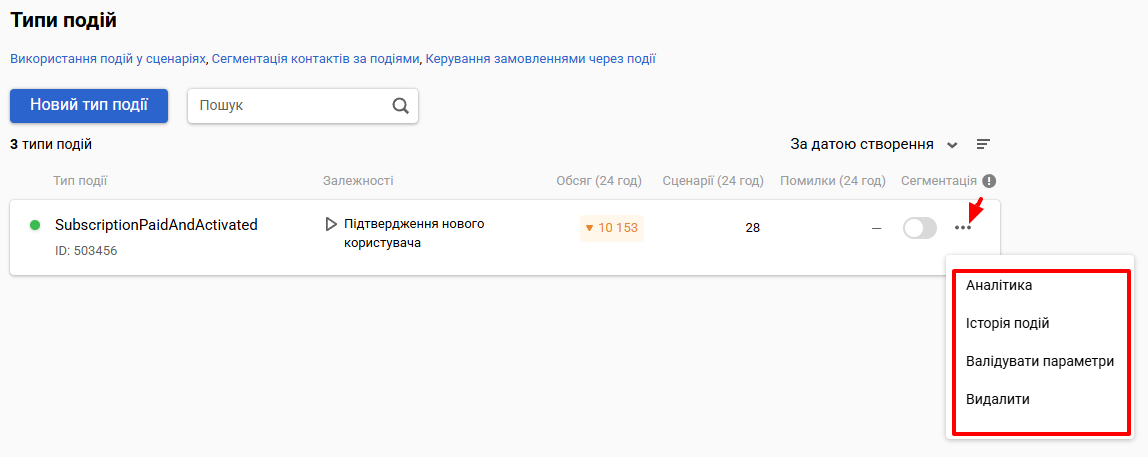 За кліком на три крапки у полі типу події з'явиться меню з такими опціями: