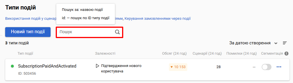 Щоб знайти певну подію, введіть її назву або ID в рядок пошуку.