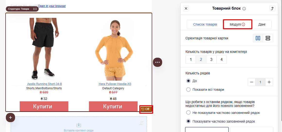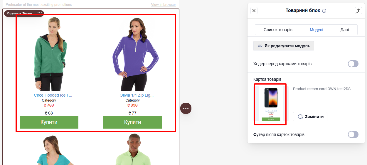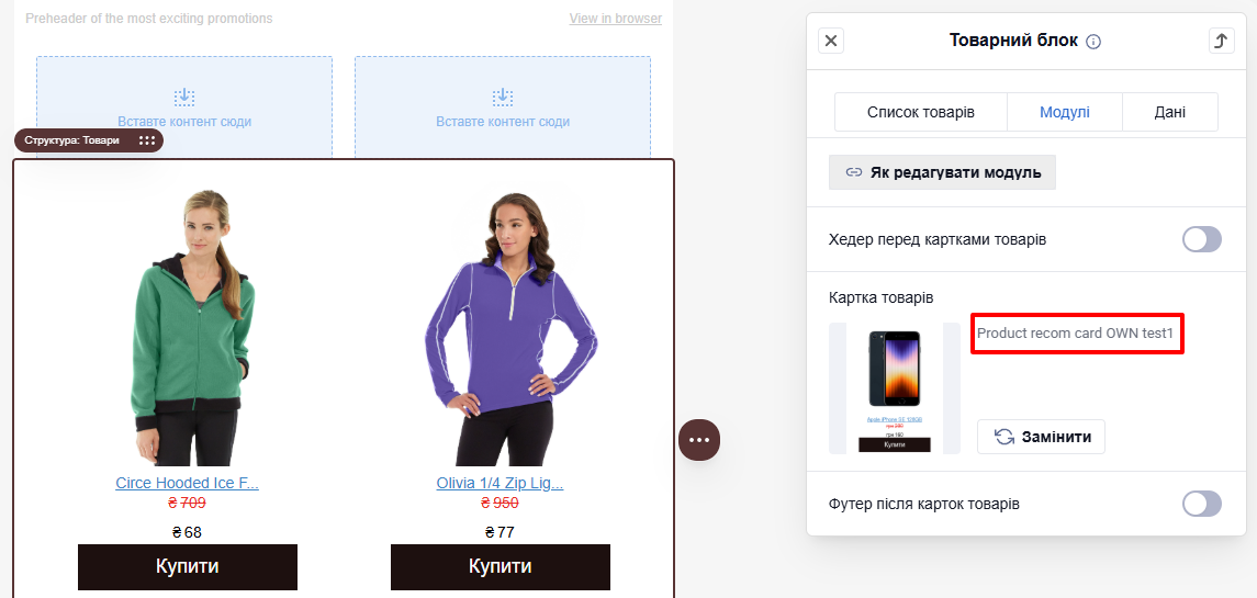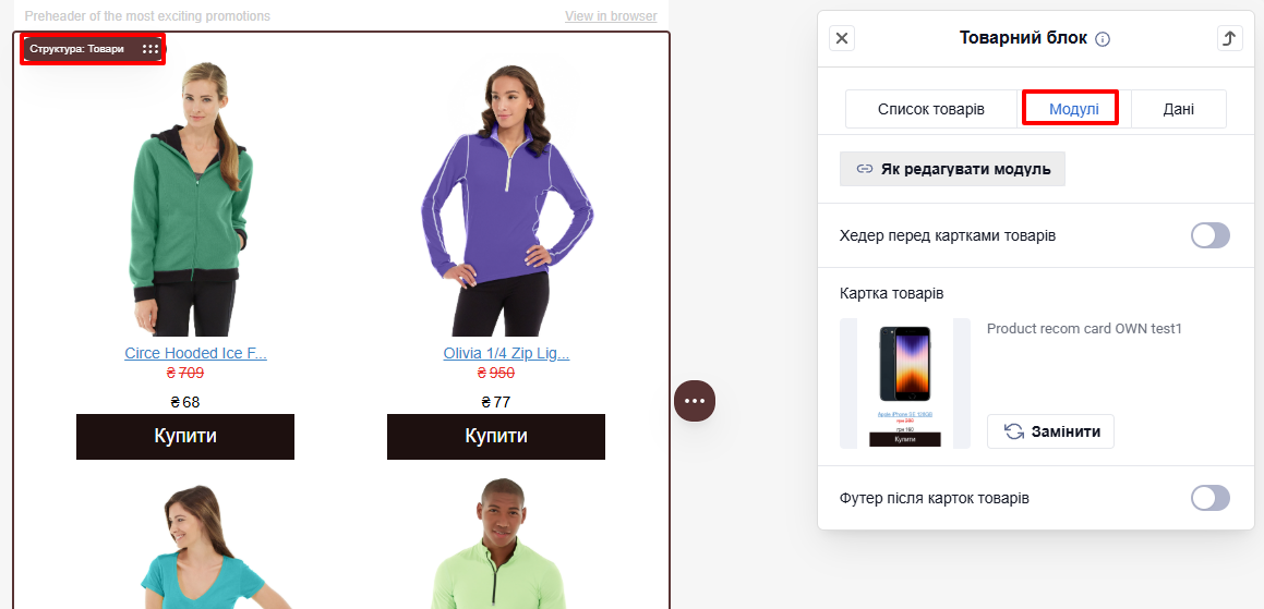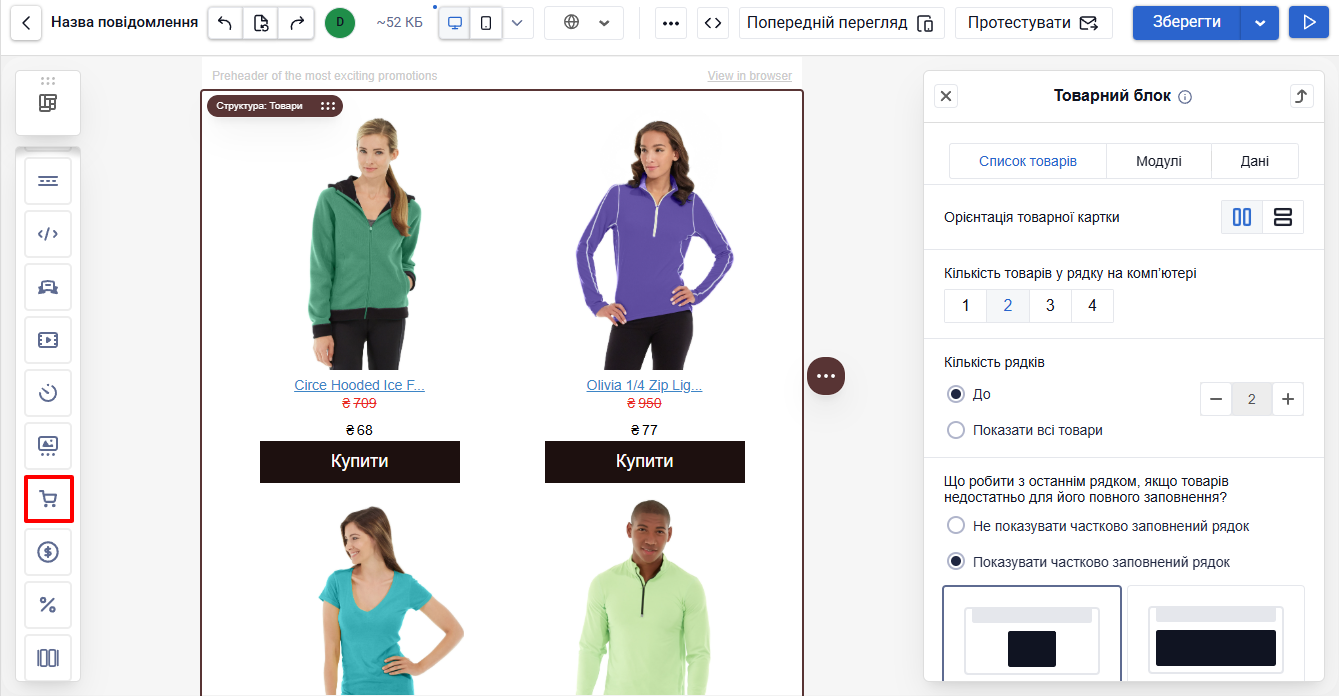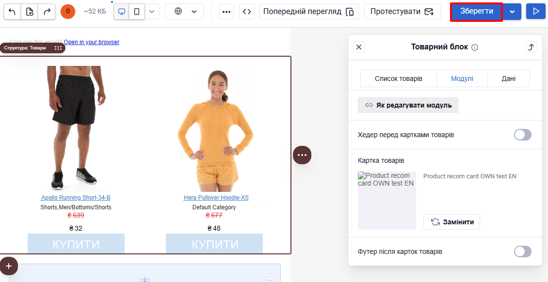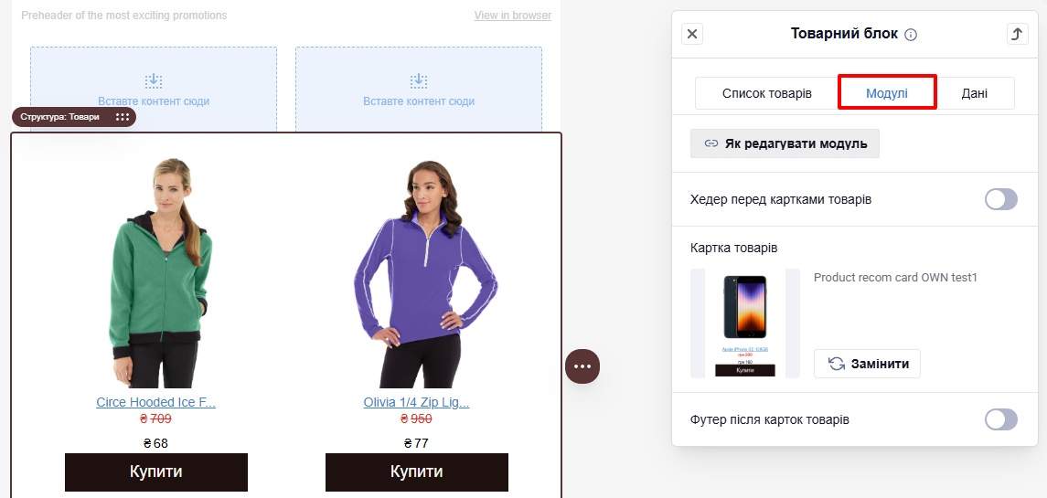 Блок Товари відображає у листі рекомендовані пропозиції. Ви можете змінити вигляд картки товару та зберегти її як модуль для повторного використання в інших розсилках.