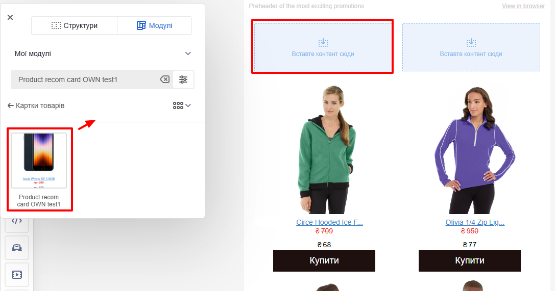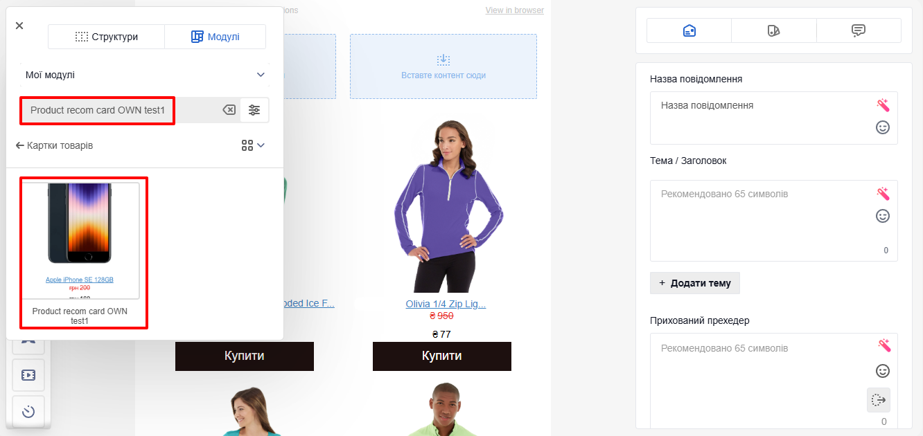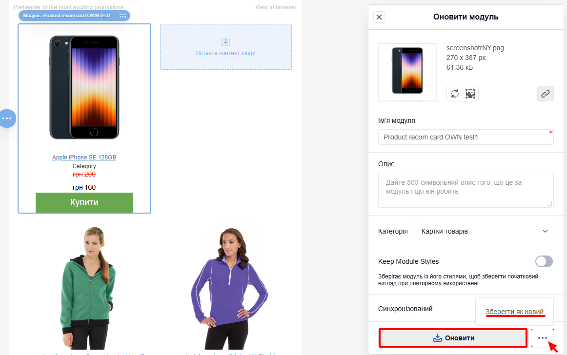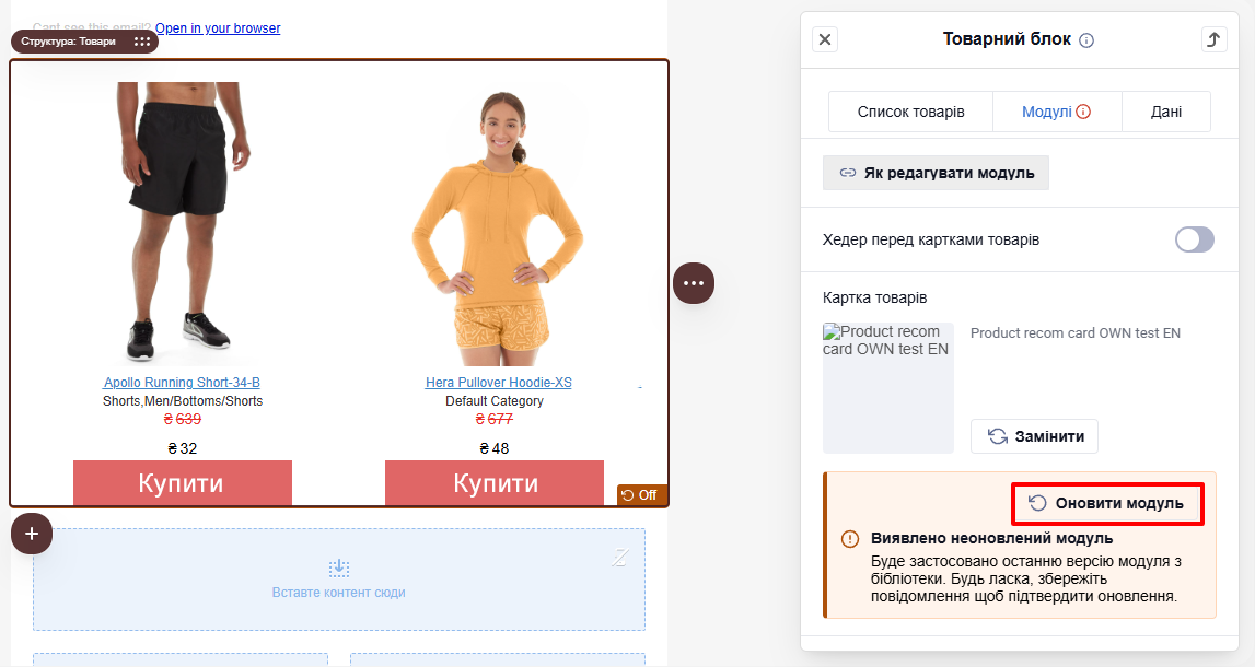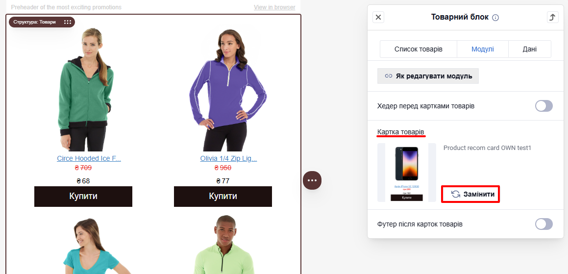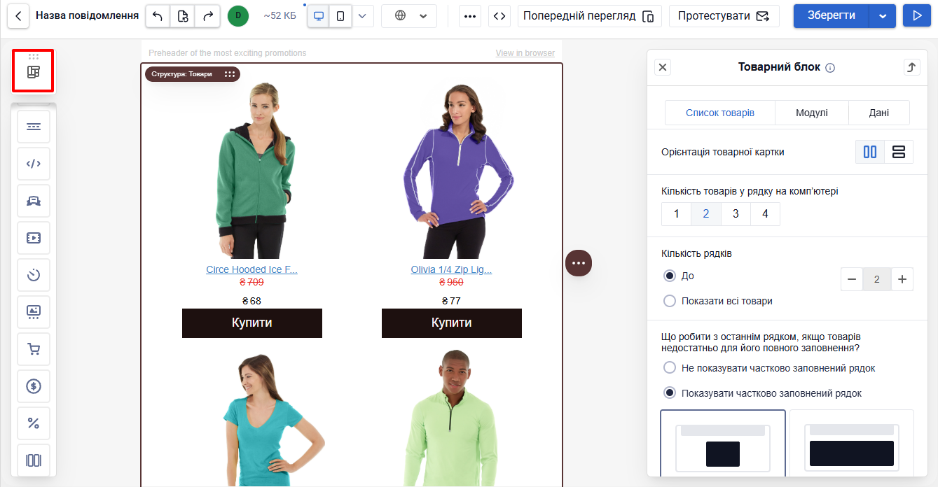 Блок Товари відображає у листі рекомендовані пропозиції. Ви можете змінити вигляд картки товару та зберегти її як модуль для повторного використання в інших розсилках.