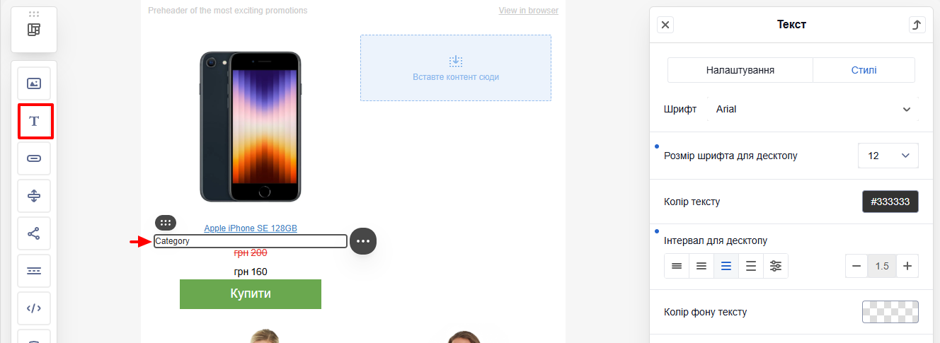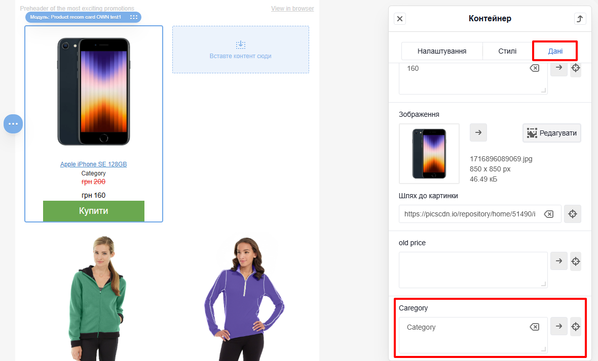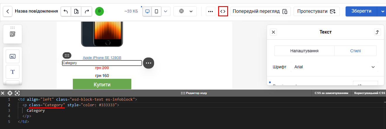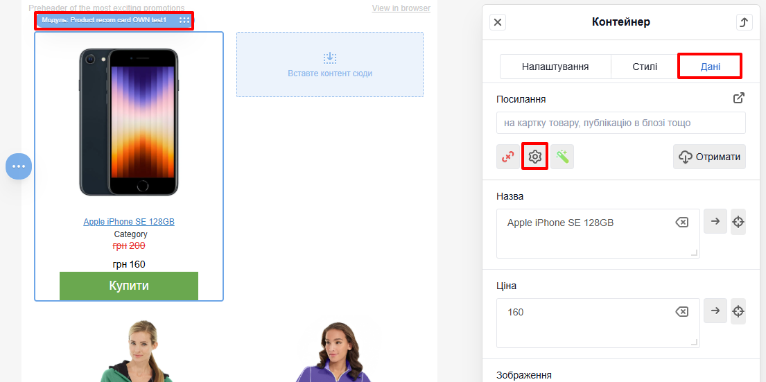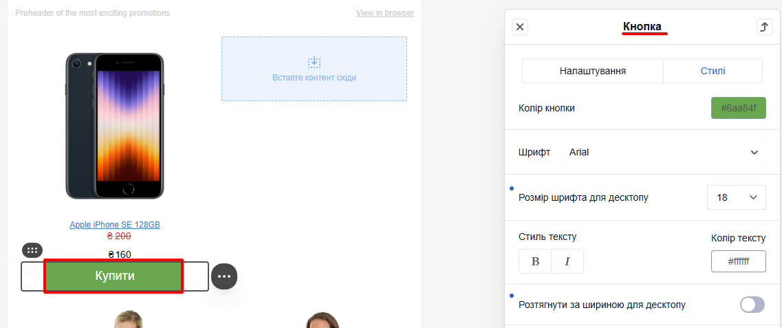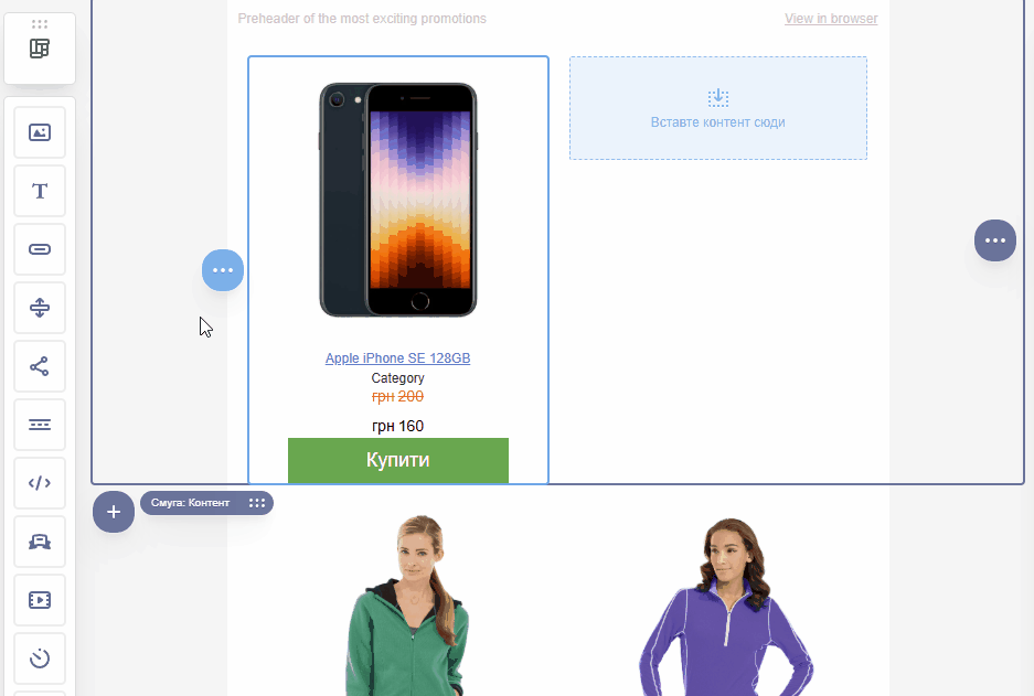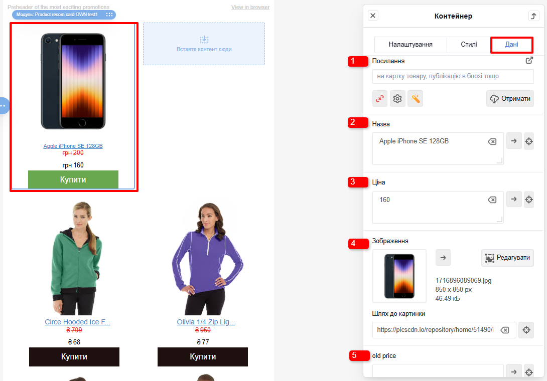 Блок Товари відображає у листі рекомендовані пропозиції. Ви можете змінити вигляд картки товару та зберегти її як модуль для повторного використання в інших розсилках.