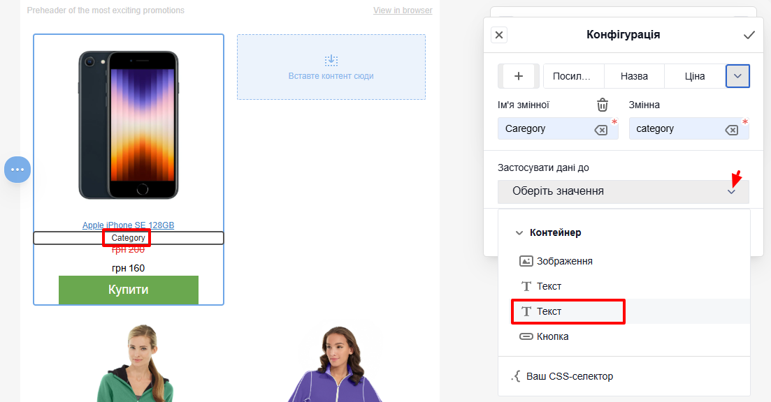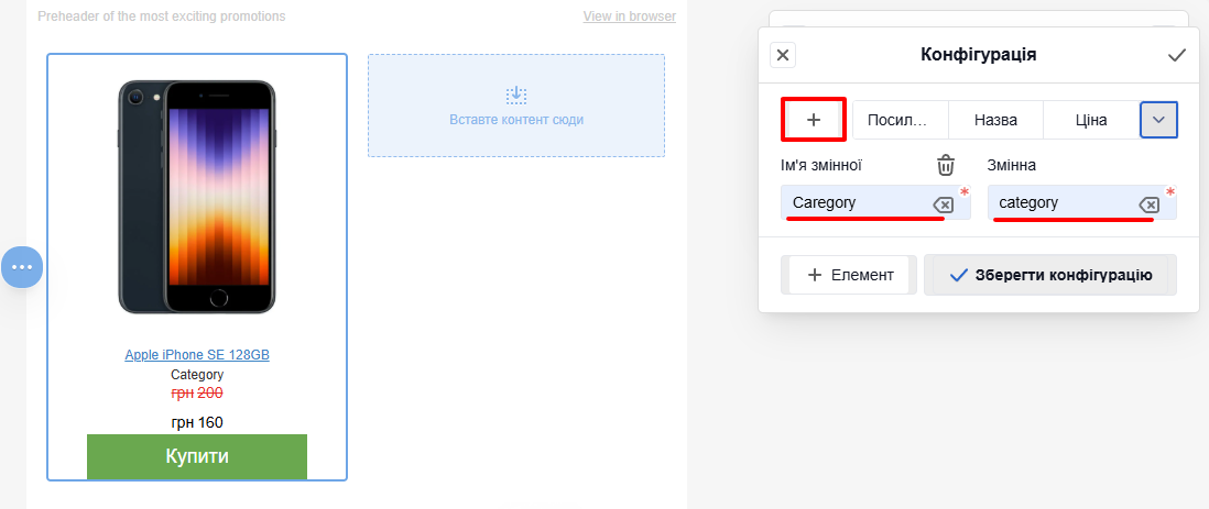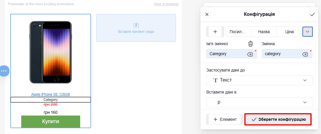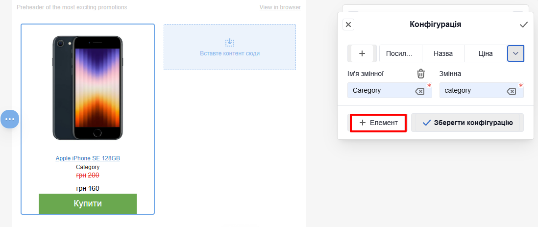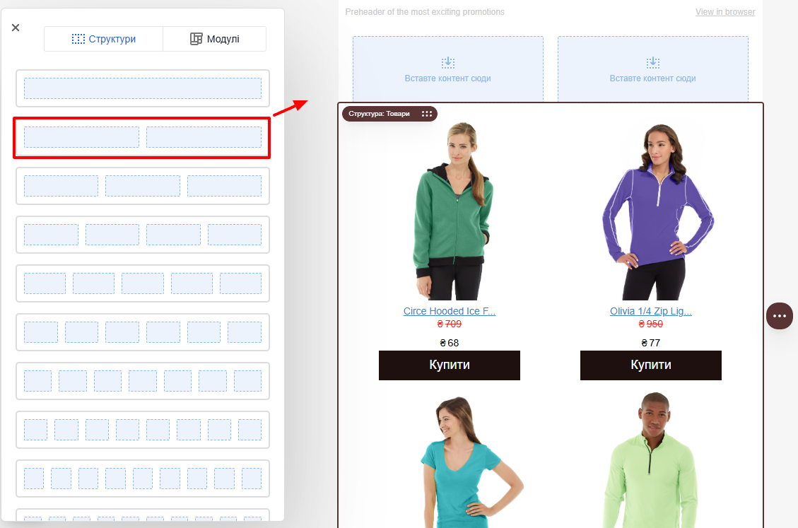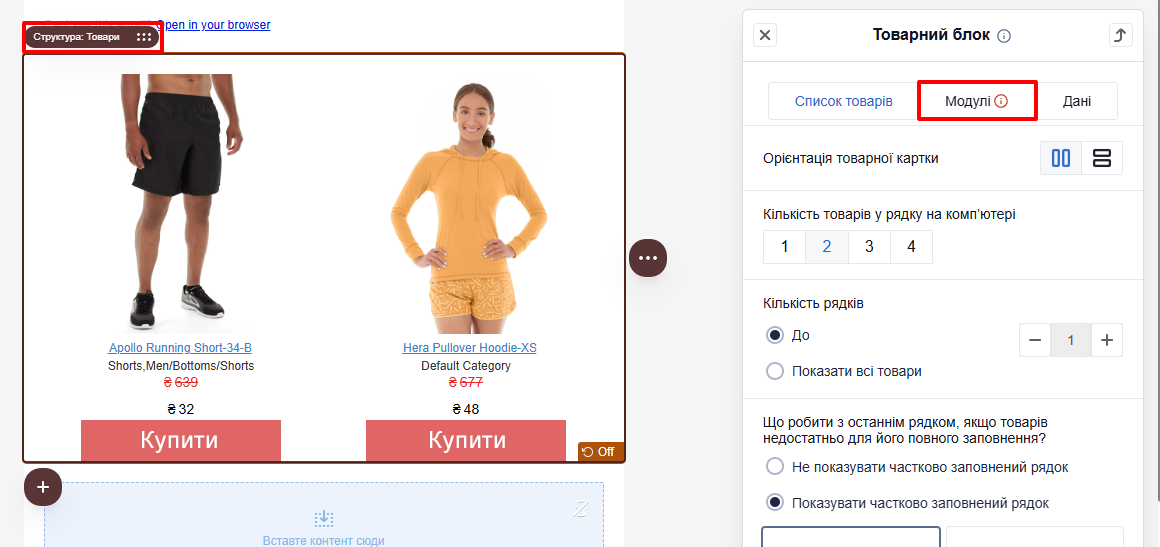 - Перетягніть блок Товари в контентну частину повідомлення.