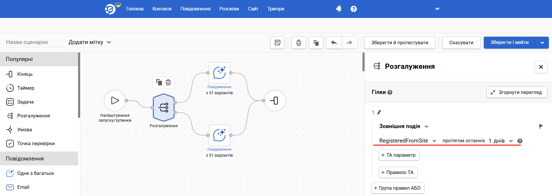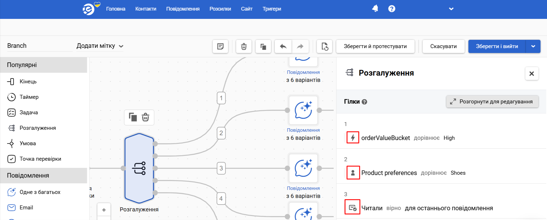 Блок Розгалуження дозволяє призначити декілька альтернативних шляхів виконання сценарію. Замість ланцюжка з великої кількості блоків Умова, в якому важко розібратися, потрібно лише налаштовувати гілки в рамках одного Розгалуження. Система перевіряє гілки згори вниз і веде контакт першою гілкою, для якої виконуються правила. Це робить складну логіку зрозумілою, компактною та легкою в підтримці.