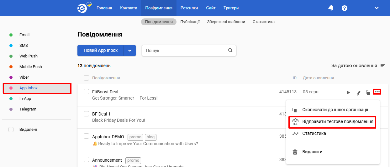- Через список повідомлень — відкрийте меню з трьома крапками справа від назви повідомлення та виберіть Відправити тестове повідомлення.