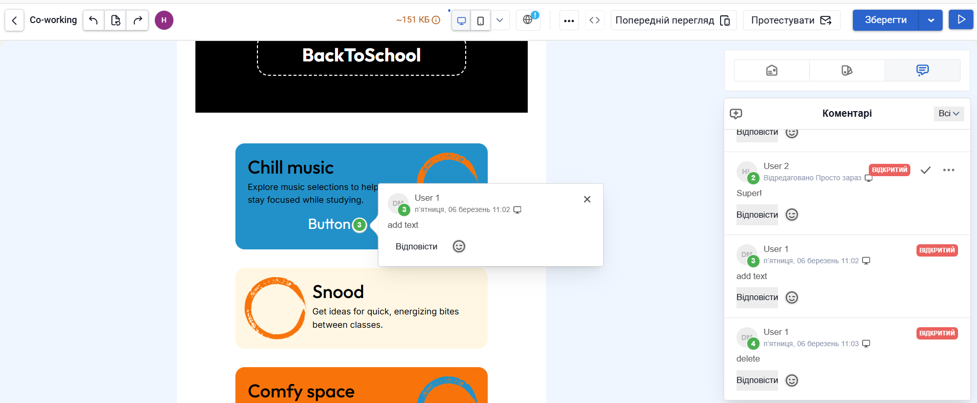 Під час спільної роботи кілька учасників можуть одночасно редагувати один і той самий шаблон. Дії кожного підсвічуються в реальному часі, тому одразу видно, над якими елементами працюють колеги.