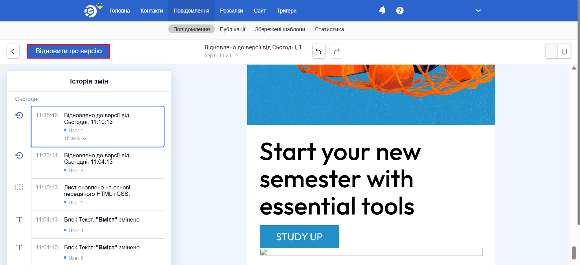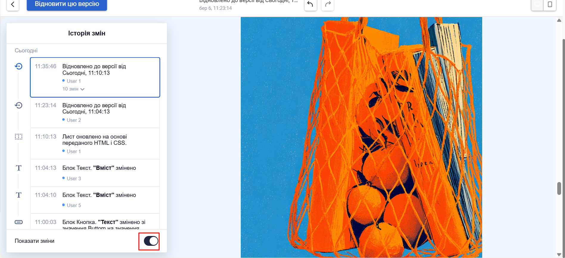 - Контроль змін. Історія змін показує, що саме й коли змінилося. Якщо правки виявилися невдалими, можна скасувати дію або відновити попередній стан шаблону.