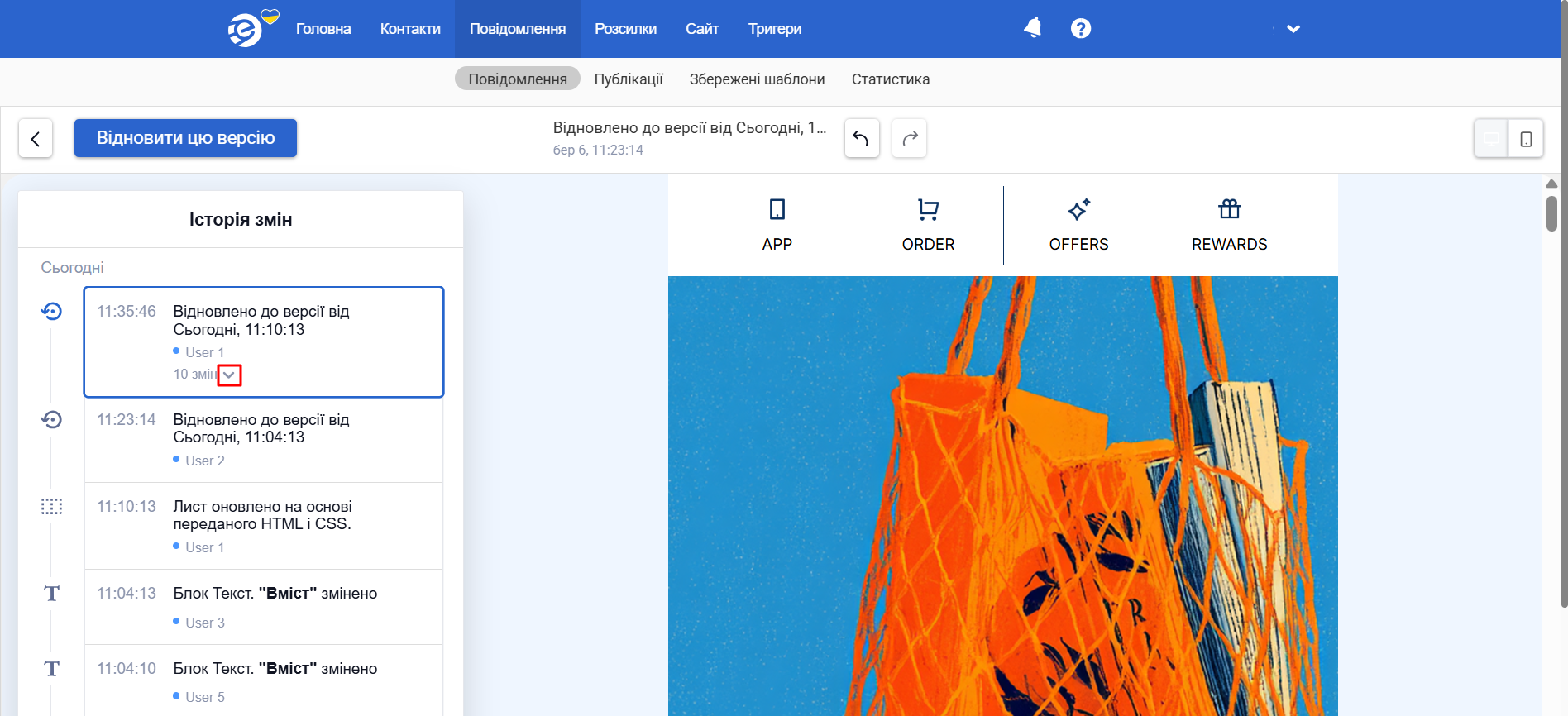 - Переглядайте всі версії повідомлення, які групуються за часом. Щоб побачити, які саме були правки, розгорніть відповідну вкладку.
