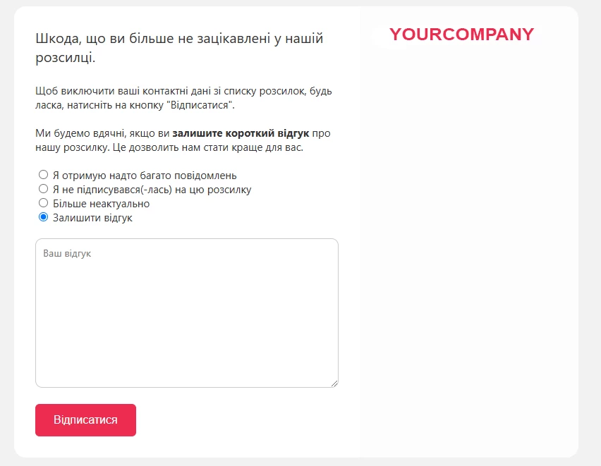Щоб налаштувати сторінку відписки у корпоративному стилі, зверніться до служби підтримки [email protected].